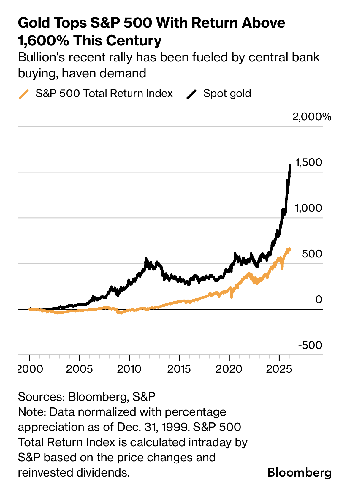 Buffett had wel een punt dat goud geen “utility” heeft zoals dividend of rente, maar desondanks is goud deze eeuw nu meer in waarde gestegen dan de S&P 500.
