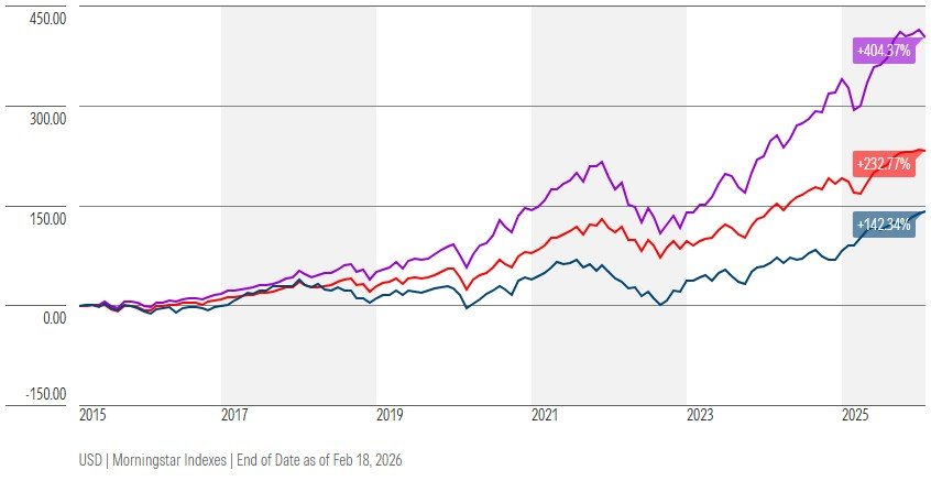Terug naar het Vaticaan. Hoe ziet het rendement er daar uit, zonder zondige aandelen? De indices zijn volgens de Morningstar website in november 2025 live gegaan, maar de backtest ziet er goed uit. Wat natuurlijk weinig zegt - niet dat ik de Vaticaanse bank hiervan verdenk, maar je kan natuurlijk makkelijk een selectie maken om de backtest te optimaliseren (Nvidia?).