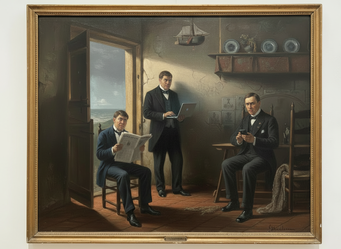 Zonder al te veel moeite zie ik de storm als een metafoor voor een beurskrach, waarbij de vader des huizes uit dit tafereel het familievermogen heeft verloren. Of een scene waarbij de beurshandelaren zelf in beeld komen, hieronder schitterend door Perplexity vormgegeven: